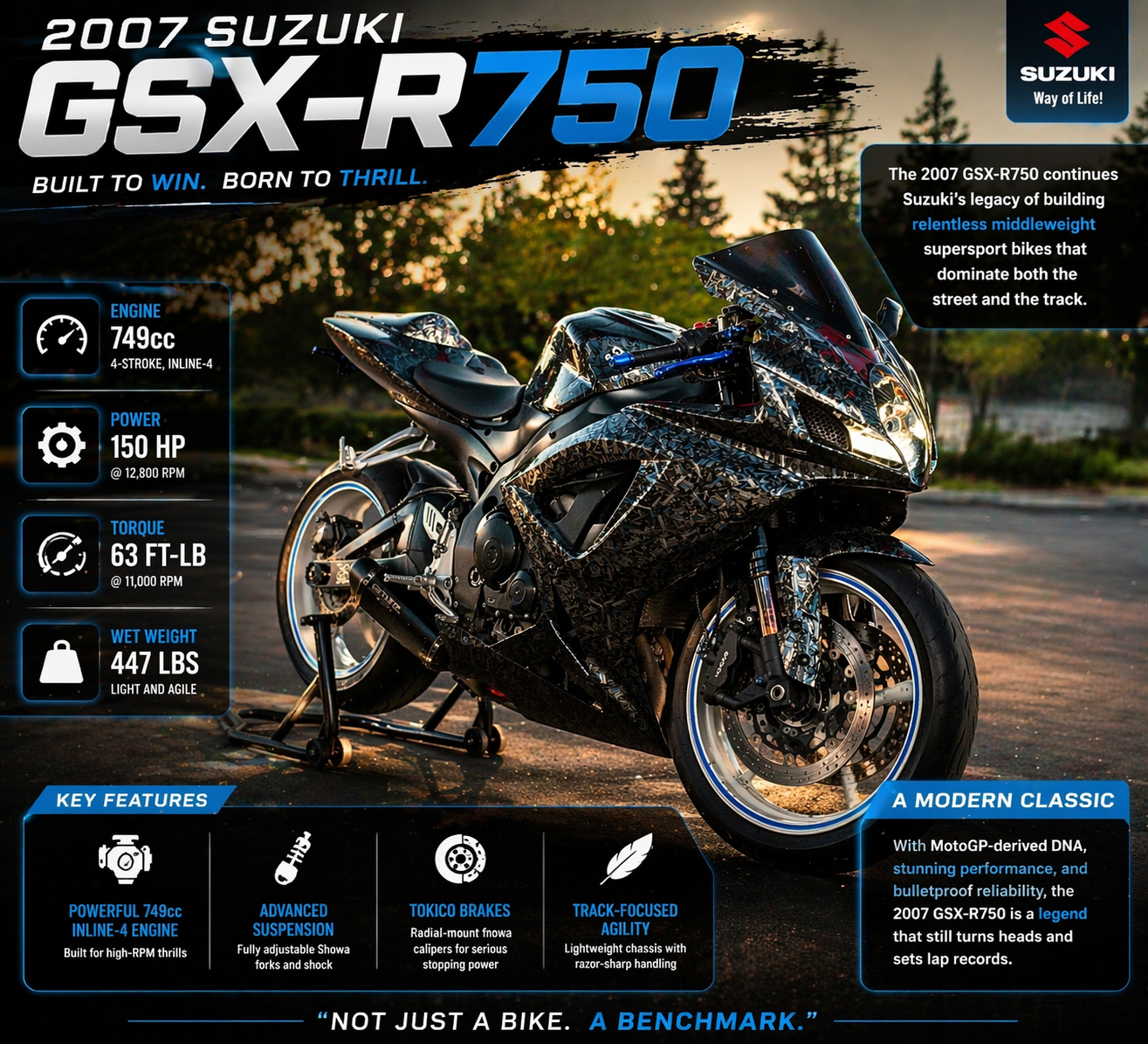 Riding the 2007 Suzuki GSX-R750 in Fayetteville, NC is pure adrenaline. The 750cc engine delivers explosive acceleration with smooth power through every gear, making it a top choice for sportbike riders near Fort Bragg and Raleigh. Its lightweight frame and sharp handling let you carve corners with confidence, while the aggressive riding position keeps you locked in. If you’re searching for a used GSX-R750 for sale near Fayetteville, this bike delivers speed, control, and unmatched performance.