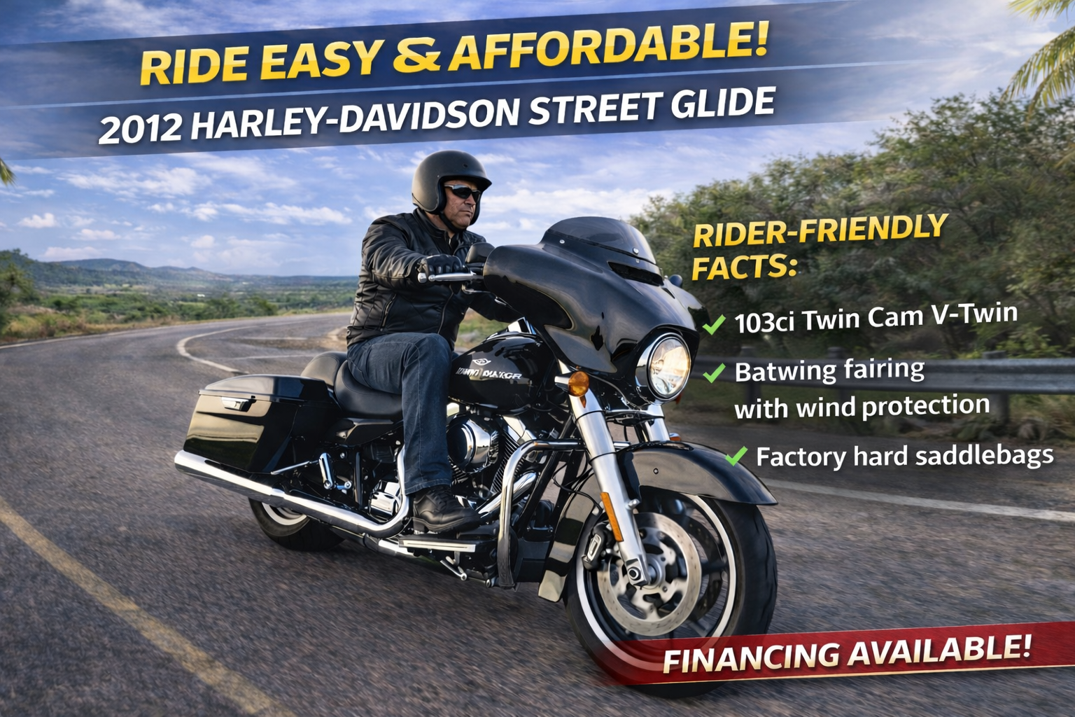 Riding the 2012 Street Glide feels smooth, confident, and full of classic Harley attitude. The moment you start it, the Twin Cam rumble hits your chest. On the road, it’s steady and comfortable, with the batwing fairing cutting wind and the suspension soaking bumps. It feels heavy at a stop but light once moving, gliding through turns with relaxed control. Every mile feels effortless, making the Street Glide perfect for cruising, touring, and soaking in the ride.