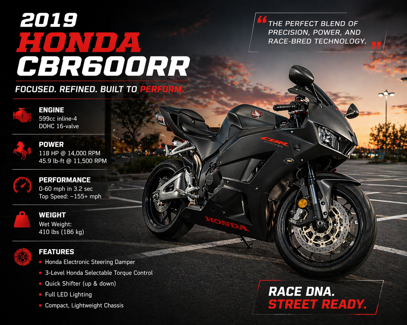 Using the same engineering lessons weve learned in MotoGP racing, this bike is a true reflection of Hondas technical prowess. Its light, compact, nimble and ideally-balanced, with a four-cylinder engine that revs like nothing youve ever ridden. The aluminum twin-spar designed chassis delivers laser-sharp handling.