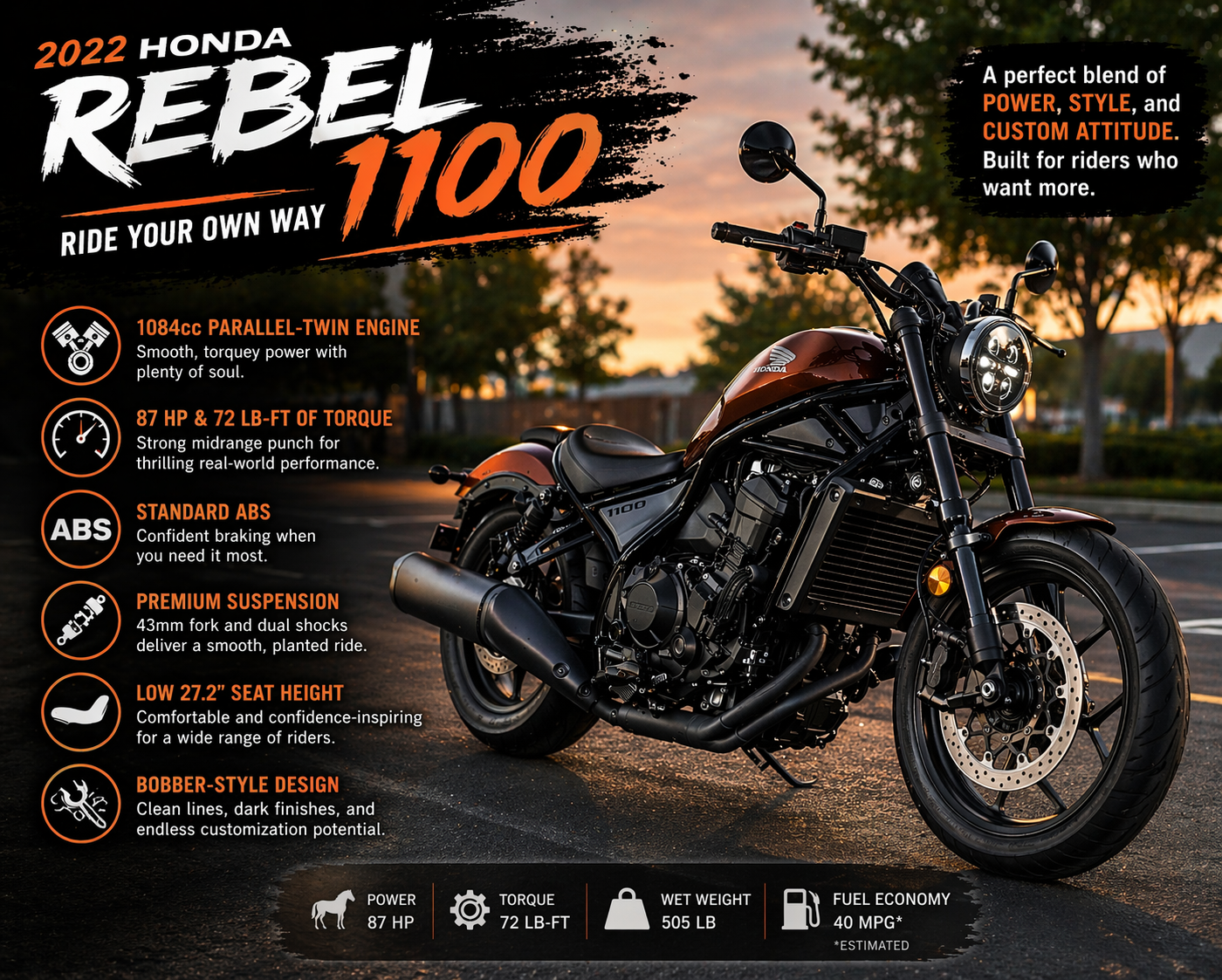 Riding the 2022 Honda Rebel 1100 is smooth, powerful, and confidence-inspiring. The 1,084cc engine delivers strong torque, making it perfect for cruising Fayetteville, NC, Fort Bragg, and Raleigh highways. Its low seat height and relaxed ergonomics create a comfortable cruiser motorcycle feel, while responsive handling adds a sporty edge. With ride modes and optional DCT, it’s ideal for riders searching Honda Rebel 1100 for sale, best cruiser in NC, and powerful beginner cruiser. At Flip My Cycle, it’s built to ride easy and hit hard.